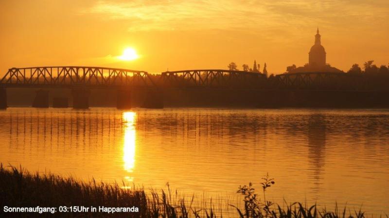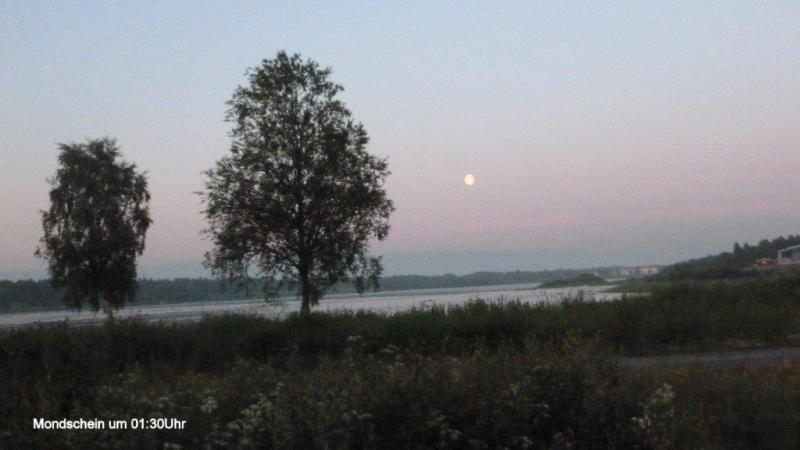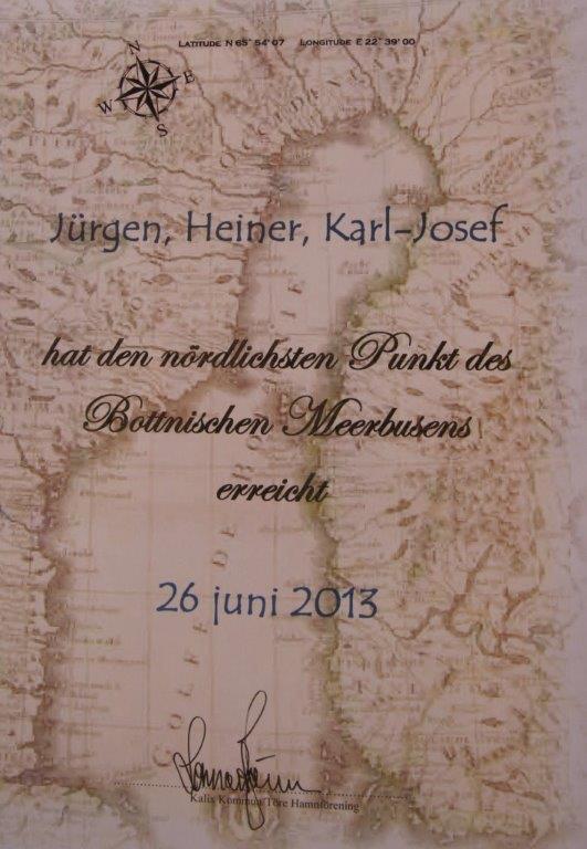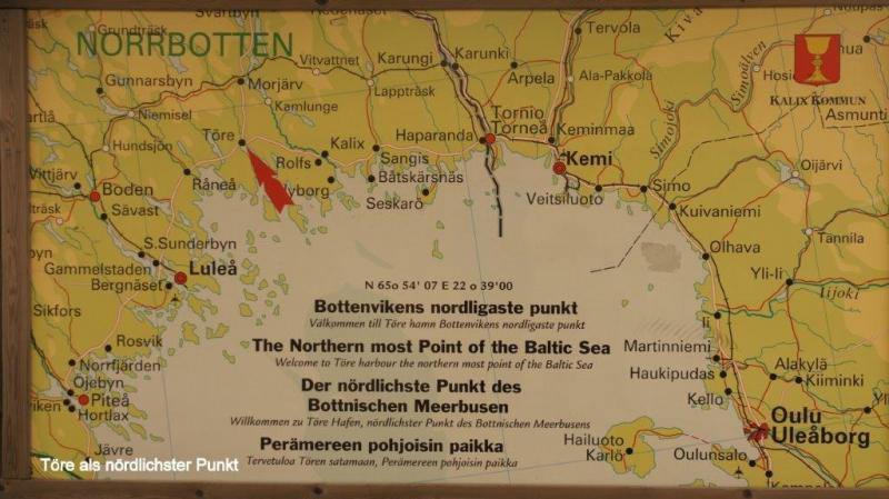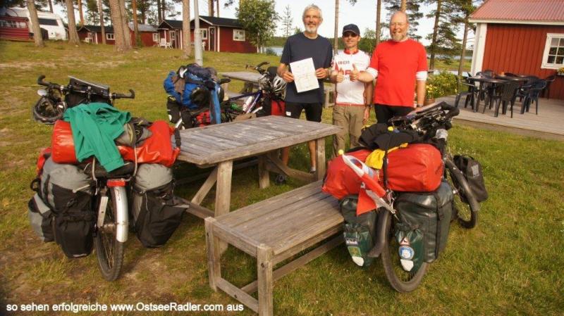 Wir wachen morgens auf unserem wilden Campingplatz bei herrlichem Sonnenschein auf und breiten auf unserem Tischtuch ein reichhaltiges Frühstück mit Tomaten Jogurt, Brot, Aufschnitt und Kaffee aus. Gegenüber dem Fluss Torneälven liegt ca. 400 m entfernt Finnland, worüber ich meinen ersten Eindruck kräftig relativieren muss. Die hohen Alkoholpreise haben sicher auch etwas Gutes. Viele freundliche Menschen habe ich kennen gelernt, obwohl viele sicher erst nach ein paar Promille ganz aus sich herausgehen. Besonders den sehr hilfsbereiten Marko habe ich in Erinnerung behalten, der uns auf dem Campingplatz alle Türen öffnete, obwohl wir gar nicht angemeldet waren und Mika, der immer wieder einige deutsche Sätze lernen wollte, weiter den sehr sympathischen Markku, der mit seinem Hütchen eigentlich aussah wie ein Bayer (der Rasenmähermann). Auf der bis in die frühen Morgenstunden bei hellem Tageslicht gehenden Mittsommernachtsfeier sind mir von den sehr liebenswürdigen Frauen Anne, Jaana, Ulla, Anja und Paula in Erinnerung geblieben. Nur 5 Mill. Einwohner, deren Lieblingssport das Eishockey und deren Erzfeind deshalb Schweden ist, besitzen ein so herrlich großes waldbewachsenes Land mit unzähligen Wasserflächen, dass man nur neidisch werden kann. Aber jetzt sind wir in Schweden und gespannt, was uns hier erwartet. Wir brechen ca. 9:30 Uhr auf und suchen vergeblich einen bereits geöffneten Bankautomaten. Wir haben ja noch keine Kronen. Im Stadtkern von Haparanda frage ich eine Frau nach einem Buchladen. Wir benötigen auch noch eine größere Schwedenkarte und kommen ins Gespräch. Sie schenkt mir einen kleinen Kunstführer mit vielen Skulpturen. Eine Skulptur verkörpert das „Brechen der Brücken“ zwischen Finnland und Schweden im Jahre 1809. Eine weitere Frau spricht perfekt Deutsch. Ihr Mann kommt aus Deutschland und ihr Sohn wohnt in Düsseldorf. Viele ältere Menschen könnten Deutsch sprechen. Dann geht es auf die E04 Richtung Lulea. Die Wälder an der Straße sind überwiegend eingezäunt. Die Straße ist dreispurig, wobei die zweite Spur wechselt. Uns bleibt nur eine ca. 30 cm breite Spur neben der Straße und es wird bei Einspurigkeit sehr eng, besonders wenn LKWs uns überholen. Die Bedeutung der Holzwirtschaft zeigt sich an den vielen Holztransportern. Mein Rad wird so durch das Hin- und Herwechseln auf den Randstreifen durchgeschüttelt, dass sich immer wieder die nur eingesteckte Rahmenaufhängung am Vorderrad löst. Jürgen, der nicht mehr zu sehen ist, wartet auf einem Parkplatz, übersieht uns aber beim Fotografieren, als wir vorbeifahren. Jedenfalls sind wir schon in Töre kaputt. Auf dem Campingplatz bekommen wir eine Urkunde über das Erreichen der nördlichsten Stelle der Ostsee. Ich schlafe schon nach - wieder eine Stunde zurück gestellter Uhr - um 20:00 Uhr ein und beginne um 22:30 Uhr neuer Zeit Uhr mit meinem Blog über Sonntag und heute.