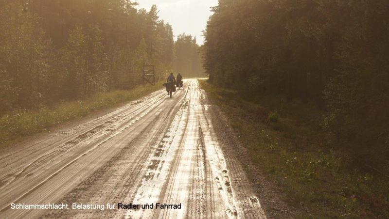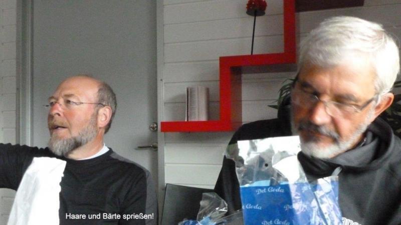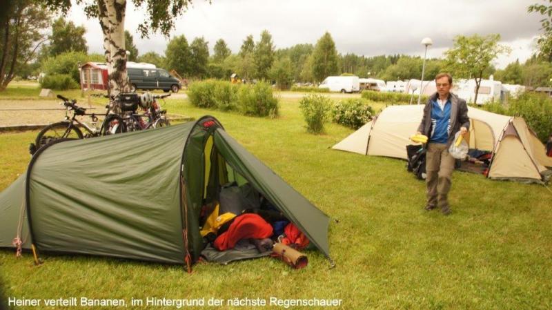 Als ich 6 Uhr wach werde, regnet es und ich raffe mich endlich um 7:30 Uhr auf in die Küche. Eier mit Speck habe ich mir diesen Morgen ausgedacht. 9:30 Uhr Besprechung der Fahrroute. Da wir es möglichst vermeiden, die E4 zu fahren, kann ich mit meiner Karte im Maßstab von 1 : 900 000 die Nebenwege nur ungefähr beschreiben. Aber auch Jürgen ist mit dem doppelten Maßstab mit seinem Latein oft am Ende und wir müssen dann doch streckenweise die E4 benutzen. Wegen des schlechten Wetters schieben wir die Abfahrt heraus. Als wir dann aber 12:30 Uhr endlich losfahren, erwartet uns ein Dauerregen, der bis 15:30 Uhr in Håknäs anhält. Dort entdeckt Jürgen einen Einkaufsladen mit angeschlossenem Imbiss. Pommes mit Cheeseburger! Hauptsache, ich werde satt. Nachdem wir ein Stück weiter gefahren sind, sehen wir schon eine dunkle Front auf uns zukommen. Die Jungs ziehen sofort ihre Regenjacken an. Ich kapituliere auch einen Kilometer weiter und habe noch Glück. Denn es schüttet danach wie aus Eimern. Die Jungs sind schon vorgefahren. Ich entdecke sie aber unter einem Haustürvordach. Ich weise darauf hin, dass die Überlebenschancen auch bei diesem Regenguss sehr hoch seien und es geht gemeinsam weiter. Zum Fotografieren hat keiner Lust. Dann hört es zum Abend hin endlich auf zu regnen und die Sonne zeigt sich sogar zwischen den Wolken. Es folgt allerding vor dem verdienten Feierabend noch ein Leckerbissen für Radler, nämlich sieben Kilometer fahren auf aufgeweichtem Waldboden. Ich fahre nur mit dem durchgeschwitzten Trikot weiter, das incl. Radlerhose und Beinkleider bei Ankunft am Campingplatz in Nordmaling − direkt an der Ostsee − gänzlich im Wind getrocknet ist. Es ist herrlich den Fahrwind zu spüren, wenn Nässe und Kälte der trockenen Wärme weichen müssen. Der Körper kann viel Hitze abgeben und der Kopf steuert zusätzlich das Immunsystem. Ende gut, alles gut! Die Sonne hat sich durchgesetzt und wir ziehen mit unseren voll behängten langen Wäscheleinen die Aufmerksamkeit des Campingplatzes auf uns. Neben uns entdecke ich einen deutschen Campingwagen aus Erdingern bei München und halte ein kleines Pläuschchen mit ihm. Er kommt mit seiner Frau und zwei − ich denke, bereits erwachsenen Kindern, oder sind es Sohn mit Partnerin? – von den Lofoten (Inselgruppe vor Norwegen in der Nordsee). Heute ist Jürgen vom Abendessen zubereiten fürs Schreiben freigestellt. Ich selbst verzichte gerne auf jegliche Freistellung, da beide Jungs für mich die Bilder in den Blog einstellen, eine wirklich sehr aufwendige Angelegenheit! Bei dieser Gelegenheit darf ich mich auch wieder ganz herzlich bei unserem lieben Teammitglied Ina bedanken, die sich ganz rührend um unseren Internetauftritt und jetzt auch noch um die Teilnahme am Meerbuscher Radlerwettbewerb sorgt. Zum Abendessen kredenzen Karl-Josef und ich heute Nudeln mit Spinat und Rühreiern, dazu Tomaten in Balsamico mit Mozzarella. Zum Nachtisch gibt es eine leckere Mischung aus Trockenfrüchten und Nüssen.