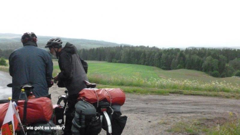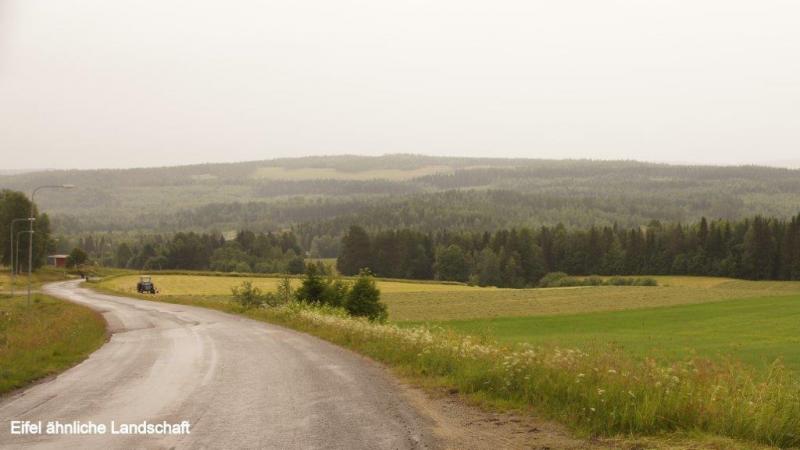 Mein morgendlicher Blick aus dem Zelt geht über den See, der durch den Fluss Moälven gespeist wird. Die Wolken verdichten sich und die anfängliche Sonne wird vertrieben. Die Dusche ist sehr ungewöhnlich. Sie ist mit einem Geldautomaten begrenzt und kostet eine Krone für 2 Minuten heißes Wasser. Das musste reichen. Nach dem Frühstück folgte die Tour-Planung, die aufgrund der in der Landschaft eigenwilligen Felsformationen immer schwieriger wird. Wir wählen nicht den Küstenradweg sondern eine Bergroute für die erste Hälfte der Strecke, weil es hier „nur 100 m“ Anstiege gibt und wir so weiter voran kommen und gerne in der Bergwelt nach dem ersehnten Elch Ausschau halten wollen. Die zweite Hälfte sollte wieder wie der vorgegebene Radweg auch über die Berge führen, jedoch ließ der dünne Strich für den Weg in der elektronischen Karte nichts Gutes zur Streckenqualität ahnen. Das Höhenprofil zeigt Gipfelpunkte von 376 m an. Das hört sich zwar nicht viel an, aber wir müssen mit 30 kg Gepäck von 15 Meter Niveau ausgehend über kurze Distanzen steigen. Zwischenzeitlich hatte sich die Wolkendecke noch mehr verdichtet, wir packten und bauten schnell das Zelt ab. Dann kam auch schon ein kräftiger Regenschauer. Wir starteten nach Abklingen des Regengusses und vorbereitet auf weiteren Regen. Unser geplanter Weg führte uns zunächst über die Landstraße 335 und dann ab dem Örtchen Grädal in die Berge auf 110 Meter über ein Plateau und hinab zu einem See, der auf ca. 65 m Höhe lag. Im Winter wird dieses schneereiche Gebiet sicherlich als Wintersportgebiet genutzt. Jetzt sehen wir weite Grasflächen, die zur Milchkuhhaltung abgemäht wurden. Auch hier wieder auf den Weiden Pferde unterschiedlicher Rassen und Höfe, die auf Pferdezucht eingestellt sind. Die Straßen sind auch hier Schotterwege, die natürlich für Fahrer und Speichen (Bruchgefahr) immer eine Herausforderung darstellen. Aber alles ging gut! Der Weg war fast trocken und die Sonne setzte sich immer mehr durch. Wir müssen Richtung Süden und zu einem Zeltplatz. Beides führt, egal welche Routenplanung man auch macht, immer zur „E4“ zurück. Es war am Nachmittag nach ca. 35 km, zum Glück immer noch trocken und in 14 km Entfernung direkt an der „E4“ unser festgelegter Campingplatz. Wir hatten die Wahl. Eine Strecke von 24 km durch die Berge bei Steigung nach 10 km auf 240 Meter oder die „E4“ mit 16 km, wobei die letzten 4 km der „E4“ wiederum auch als Radweg ausgewiesen waren. Die Entscheidung fiel auf die kurze Strecke über die „E4“ und wir hatten wieder mal Glück. Einmal war nicht viel Verkehr und zweitens hatten wir auch hier Steigungen auf bis zu 200 m zu bewältigen und daher eine doppelte Fahrspur, so dass für alle genug Platz blieb. Der Campingplatz lag 11 km hinter der Kleinstadt Docksta und natürlich heißt das vor der Ankunft immer Vorräte auffüllen und das Abendessen planen. Heiner kochte ein hervorragendes Menü: In meinem großen Napf stapelte er festen Reis, gebratenes frisches Gehacktes mit Zwiebeln und darüber Ratatouille! Gut gewürzt in großen Portionen. Danach hieß es 3 Tage für den Blog fertig machen und dank der kostenlosen Netzverbindung auch absenden. Nach ersten Vorüberlegungen zur weiteren Strecke war für mich dann gegen 23:00 Uhr der Tag zu Ende – obwohl wie immer – es noch sehr hell war.