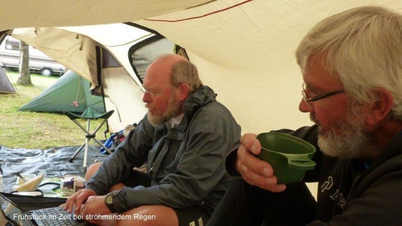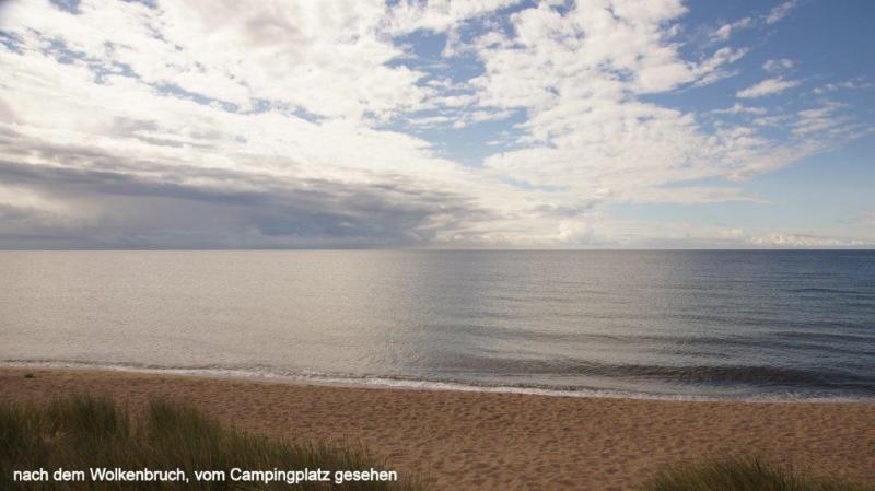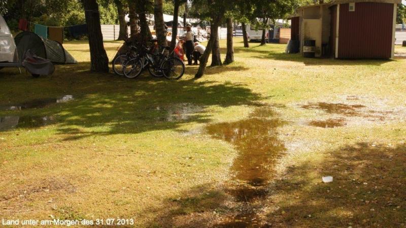 Mittwoch, den 31.07.2013; von Ystad bis Trelleborg; Frühstück im Zelt bei strömendem Regen; wie entwickelt sich das Wetter heute? Kommen wir unter diesen Bedingungen an den südlichsten Punkt Schwedens? Ein neuer Rekord!