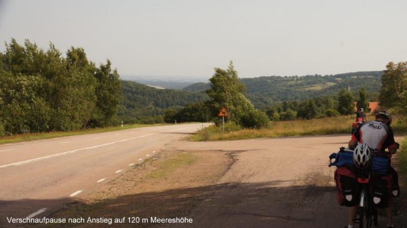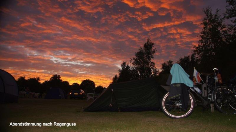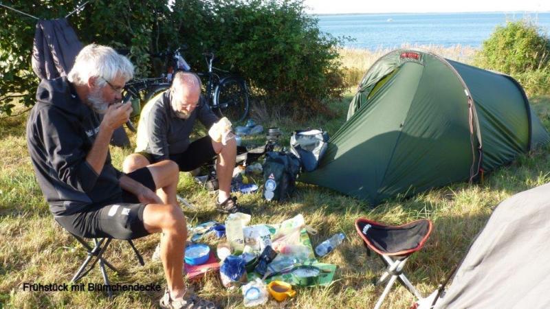 Wenn ich am frühen Morgen die Augen aufmache, erfolgt die örtliche Orientierung. Was ich sehe ist immer gleich. Freund Heiner rechts und die gelbliche Zeltdecke über mir. Wo das Zelt steht ist auch an den Geräuschen festzumachen. Straßenverkehr, Schritte über den nahen Fußweg oder nur das Geschrei der Möwen oder sonstiger Vögel. Diesmal war es sehr ruhig. Weit entferntes Möwengekreische und selten ein langgezogenes, aber tieferes Geräusch eines vorbeirauschenden Zuges. Richtig, wir hatten unser Zelt auf einer höher gelegenen Wiese am Meer aufgebaut, da der Campingplatz für Zelte nicht mehr aufnahmefähig war. Der nächste Gedanke galt dem Wasser. Katzenwäsche ist noch möglich und Wasser für Kaffee sicherlich genug vorhanden. Gestern Abend hatten wir vorgesorgt. Zelten in freier Natur, das ist nicht nur Pfadfinderromantik, sondern immer wieder ein Erlebnis wenn – und das ist für jeden „modernen Menschen“ heute wichtig – bestimmte Grundbedürfnisse gestillt werden können. Dazu gehört Essen und Trinken und natürlich auch die Hygiene. Am Morgen hatte Jürgen unseren Benzinkocher (der leider nicht gut funktionierte – Jürgen berichtete darüber in einem zurückliegenden Blog) trotz aller Widrigkeiten dazu gebracht, heißes Wasser für unseren Nescafé zu erzeugen. Die schon gelobte Blümchentischdecke wurde auf dem Gras ausgebreitet und alles Vorrätige darauf verteilt. Ringsherum war alles genutzt, was zum hoch- oder festhalten feuchter Kleidung zwecks schneller Trocknung zur Verfügung stand. Kurzum, das Frühstück war wie immer, die Natur mit Blick auf die Ostsee wunderbar. Eins möchte ich nicht verschweigen, der morgendliche Gang auf ein „stilles Örtchen“ gestaltete sich im buschig steilen und steinigen Gelände am Ufer anders und zur Hygiene wird danach ebenfalls Wasser benötigt. Hier möchte ich mit meinen Beschreibungen enden, ohne nicht noch einen Punkt unserer fast nun 100-tägigen Reise beim nur wenige Male erfolgten freien Campen zu erwähnen. Strom haben wir an diesen Plätzen nicht. Das heißt Batterien können nicht aufgeladen werden und das Notebook zum Schreiben der Blogs funktioniert nicht. Ich hatte bei diesen Gelegenheiten immer Zeit, Streifzüge in der unmittelbaren Umgebung mit Tier und Pflanzenbeobachtungen durchzuführen und mit Ruhe viele Fotos zu schießen. Fazit, alles ist eine Frage der guten Vorbereitung und sicheren Ausrüstung beim „Wildcampen in freier Natur“. Zeltabbau und Packsäcke aufs Fahrrad erfolgte recht schnell und so waren wir früh auf dem Sattel. Unsere Route verlief zunächst auf dem bekannten Cykelspåret. Wir entschieden uns jedoch den Bogen längs der Küste nicht zu folgen, sondern um schneller voran zu kommen, weiter ins Landesinnere zu fahren. Das bedeutet auch hier, hoch über die hüglige Landschaft eine Steigungen von einmal 7 % von 10 m über Meereshöhe auf 130 m. Zusätzlich blies uns ein stetiger Wind entgegen. Dieses nahmen wir in Kauf und kürzten die Strecke wegen der vorgelagerten Landzunge zwischen den Orten Vejbystrand und Bastad entscheidend ab. Nun führte unser Weg wieder an die Küste. Im Landesinneren bestimmten goldreife Kornfelder das Bild. An der Küste erleben wir das bekannte Bild der sonnenhungrigen Strandbesucher und verträumte kleine Häfen. Wir durchqueren die Kleinstadt Halmstad an der Mündung des Flusses Nissan und fahren einen Campingplatz an der Landstraße N610 an. Eine sehr neue parzellierte Anlage erwartet uns. In den Zeltaufbau prasselt ein kurzer Regen und sorgt etwas für Hektik und eine nasse Zeltunterlage. Alle Packsäcke kommen ins Zelt und die Sonne hat nach 20 Minuten alles wieder aufgetrocknet. In der modernen Küche mit viel Platz und Sitzgelegenheiten wird das Abendessen eingenommen und dann noch bis in die späten Abendstunden am Text für den Blog gearbeitet und es werden Fotos bewertet und den Berichtstagen zugeordnet und beschriftet. Nun sind wir wieder ein gutes Stück näher an Göteborg heran und damit rücken die Überfahrt nach Dänemark und der Weg in den Süden und damit nach Hause näher.