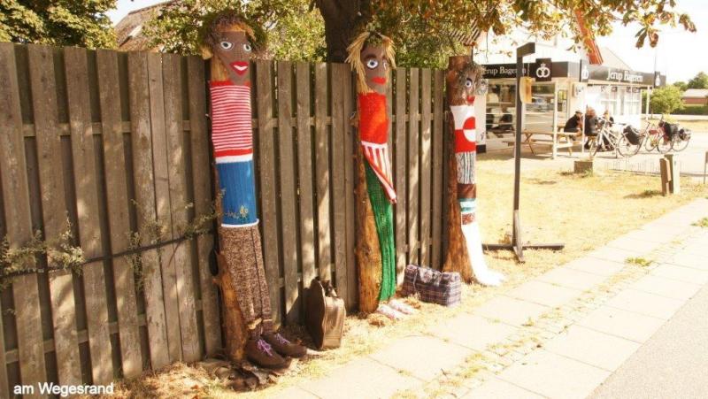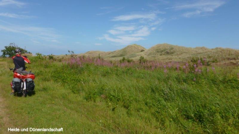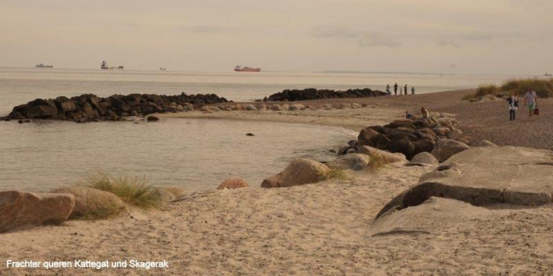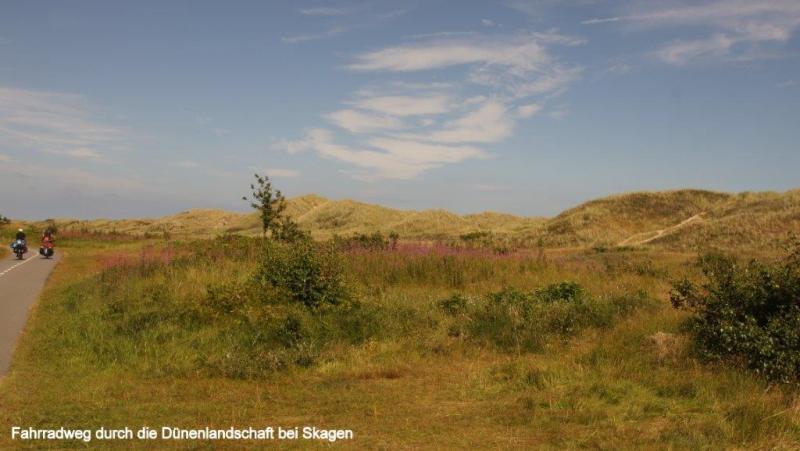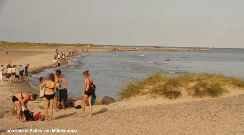 News zum 07.08.2013: Morgens 6:30 ist Wecken. Wir wollen ja um 10:00 Uhr die Fähre nach Frederikshavn erreichen. Um 9 Uhr fahren wir los. Die Jugendherberge hatte eine gute sanitäre Ausstattung und auch die Küche mit Aufenthaltsraum und Kühlschrank war sehr ansprechend. Allerdings lag unser Zimmer an einer Bushaltestelle und viel befahrenen Straße. Der Fußgängerweg lag unmittelbar am Fenster, das lediglich knapp einen Meter über den Weg ragte. Wir sind pünktlich mit Hilfe eines Aufzuges am Kartenschalter für eine Überfahrt, werden aber von einer Mitarbeiterin darauf hingewiesen, dass wir mit unseren Rädern zum Einchecken ca. einen Kilometer weiterfahren müssten. Dort angekommen können wir auch an den Autos vorbei direkt in den Bauch der Fähre fahren. Wir müssen uns zunächst mit einem Platz in der Mitte des Schiffes begnügen. Aber nach einer Weile gelingt es mir einen Fensterplatz zu ergattern und die Überfahrt mit Kaffee, Brot, Plätzchen und meinem iPod zu genießen. Nach Ankunft um 13:15 Uhr in Frederikshavn machen wir uns zunächst auf die Suche nach einem dänischen Bankautomaten. Wir erfahren, dass 100 dänische Kronen 1,45 Euro entsprechen. Nach einem Picknick auf einem Kirchhof geht es weiter an die nördlichste Spitze Dänemarks, dem 40 km entfernten Skagen, dass wir nach drei Stunden um 17 Uhr auf einem vorzüglichen Radweg vorbei an Dünen und Heidelandschaften erreichen. Dann müssen wir noch ca. 3 km bis zur Küste fahren, wo uns schon ein großer Parkplatz erwartet. Auf der höchsten Erhebung liegt ein riesiger Kompass aus Bronze, der die Himmelsrichtungen anzeigt. Nicht weit entfernt steht ein großer Leuchturm. Wir sehen aufs Meer hinaus und entdecken eine Vielzahl von Schiffsfrachter, die um dieses „Cap Horn“ herum müssen. Hier scheidet sich die Nordsee (Skagerrak) von der Ostsee (Kattegat). Dies kann man deutlich an einer blau –braun Verschiebung der Farben erkennen. Wir beschließen noch Richtung Strand zu gehen, wo viele Urlauber im warmen Wasser schwimmen. Na, denke ich, ob die beiden vielleicht zumindest mit den Füßen ins Wasser wollen und gehe mit den Füssen im Wasser mutig voran. Wir müssen dann leider den Strand verlassen, um noch rechtzeitig für das Abendessen einkaufen zu können. Wir kommen in der Nähe der Küste auf einen Campingplatz, der zwar nichts zu wünschen übrig lässt, aber auch seinen stolzen Preis hat. Da Jürgen heute frei zum Blogschreiben hat, fahren Karl-Josef und ich in den ca. 3 km entfernten Stadtkern einkaufen. Es gibt Nudeln mit Champions und Tunfisch in Tomatensauce, angereichert mit 6 Tomaten und drei gekühlten Dosen Carlsberg, wieder mit den uns zu Hause vertrauten Promille von 5,3 %. Dabei hatten wir uns die ganzen Wochen in Schweden wirklich an die 2,8 % gewöhnt. In der Nacht fängt es an zu regnen und ich schließe das Zelt vollständig.