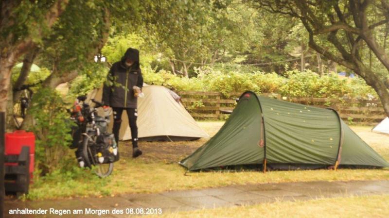 Es hatte sich gestern Abend schon angedeutet und der Regen kommt dann auch über Nacht und hört den ganzen Vormittag nicht mehr auf. Wir hatten den Campingplatz ausgesucht, in der Hoffnung bei Sonnenschein heute Vormittag vielleicht noch klarer die Farbunterschiede der braunen Ostsee des Kattegat und der blau-grauen Nordsee des Skagerrak bei anderem Lichteinfall sehen zu können. Da wird nun leider nichts draus. Stattdessen sitzen wir hier auf dem Campingplatz fest. Aber zum Glück gibt es einen großen Aufenthaltsraum und in diesem sogar Steckdosen, um unsere diversen elektrischen Geräte aufzuladen. Hier in Skagen ergeben sich verschiedene Gespräche mit Tourenradlern. So ist ein dänisches Ehepaar mit einem Tandem und Anhänger unterwegs, wie ich es verschiedentlich mit Elisabeth auch gemacht habe und wir tauschen unsere Erfahrungen aus. Ein junges Pärchen das in Köln studiert, werden wir am Abend wieder treffen. Auch unterwegs treffen wir hier an der Ostküste nun häufig entgegenkommende Reiseradler, die für wenige Wochen ihre Touren machen. Es ist natürlich immer besonders interessant, wenn wir gefragt werden, wohin wir unterwegs sind und woher wir kommen. Besonders effektvoll ist es, nach Süden zu zeigen und zu antworten, dass ich auf dem Weg nach Hause bin und wenn ich dann zurück zeige und erkläre, dass ich rund 7000 Kilometer aus dieser Richtung komme. Es folgt dann immer ein ungläubiger Blick und am liebsten erklärt Heiner den Fragestellern dann sehr ausführlich, welchen Weg wir auf uns genommen haben. Der Regen verschafft uns die nötige Pause, um Blogs fertig zu machen. Hierzu möchte ich einmal unsere unterschiedlichen Beweggründe darlegen, warum wir diese Arbeit auf uns nehmen. Ja, es ist schön, einem interessierten Kreis praktisch im Abonnement eine Soap Opera zu liefern. Aber es gibt auch noch andere Gründe. Bei einer so langen Tour verschwimmen sehr schnell die Erlebnisse ineinander und uns fällt auf, wenn wir versuchen mehr als 4-5 Tage später uns zu erinnern, auf welchem Campingplatz wir waren, wie wichtig ein Reisetagebuch ist. Unsere Berichte ergänzt durch unsere Fotos halten die Erinnerung z.B. an Unterkünfte aufrecht. Genauso ist es mit vielen Erlebnissen, Erschwernissen und sonstigen Gegebenheiten. Durch das Füttern unserer Website haben wir die Möglichkeit, eine besondere Art des Tagebuchs zu pflegen. Ein dritter Punkt ist, dass wir einige Begegnungen mit Radlern hatten, die Interesse signalisiert haben, sich unsere Blogs anzusehen, um Beschreibungen in die Planung bestimmter Streckenabschnitte mit einzubeziehen. Dies kann ja auch Radler betreffen, die, wie wir es auch in der Vorbereitung gemacht haben, im Internet recherchieren. Daher ist der Inhalt unseres Blogs also nicht immer nur reines Entertainment, sondern wir versuchen auch einige Informationen weiterzugeben. Möglicherweise sind die Texte mitunter etwas trocken zu lesen und vielleicht begeistern die Fotos im Blog mehr noch als unsere Texte. Hier möge sich ein Jeder, das für ihn Genehmste raussuchen. Ich denke, dass die unterschiedlichen Wahrnehmungen und Erzählstile, die jeder von uns Dreien hat, auch einen besonderen Reiz haben. Natürlich diskutieren wir auch schon mal kontrovers über das. was in eine News gehört oder nicht. Da die Blogs einen Bestand über den Tag hinaus haben und möglicherweise auch in 1-2 Jahren von neuen Lesern aufgegriffen werden, die sich für Touren um die Ostsee interessieren, fanden Karl-Josef und ich es z.B. nicht so passend, den Blog für Geburtstagsgrüße zu nutzen, was über Mails, Telefonate oder als Kommentar genauso gut erfolgen kann. Was uns immer wieder vor Probleme stellt, ist die Versendung von fertig gestellten Blogs. In den skandinavischen Ländern werden auf den Campingplätzen immer erhebliche Gebühren verlangt, die dann 24 h sicherstellen. Wir brauchen aber in der Regel nur 5-10 Minuten. Wie hier auf dem Campingplatz in Skagen habe ich mittlerweile herausgefunden, dass man mich auch schon mal kostenlos den Rechner in der Rezeption eines Campingplatzes benutzen lässt. Auch bei einem McDonald's oder in Touristen-Informationen hat man oft kostenloses WiFi. Wir nehmen uns auch immer viel Zeit für die einzelnen Berichte und für die Bildauswahl, bzw. Beschriftung und daher kommt es leider gelegentlich zu mehreren Tagen Rückstand. Heute aber schaffen wir es, diesen Rückstand nahezu aufzuholen. Mittlerweile kommt so gegen 14:00 Uhr auch schon wieder der Hunger auf und wir mümmeln unsere am Morgen geschmierte Brote auf. Eine weitere Stunde später hört der Regen auf und hurtig wird alles zusammengepackt, leider auch das tropfnasse Zelt. Wir haben Glück, denn es bleibt trocken unterwegs, als wir nun zum ersten Mal auf unsrer Tour um die Ostsee endgültig in Richtung Süden fahren. Es ist die gleiche Strecke von ca. 40 km, die wir gestern von Frederikshavn zum nördlichsten Punkt von Mitteleuropa (ich wusste gar nicht, dass es diese Bezeichnung gibt) gefahren sind. Auch heute geht es wieder über den erstklassigen Radweg durch die Dünen und Heidelandschaft. Da es nun schon Nachmittag ist, fahren wir direkt am Hafengelände von Frederikshavn vorbei. Es geht nun auf einem begleitenden Radweg der Küstenstraße immer in Sichtweite der Ostsee. Hier laufen Felder und Weiden bis an den Küstenrand. Auf den Weiden faulenzen verschiedentlich Kühe, aber hin und wieder gibt es auch eine Pferdekoppel. Es ist nicht zu übersehen, hier in Dänemark überwiegen Kleinwagen im Vergleich zu Schweden, wo wir fast ausschließlich nur Fahrzeuge der Oberklasse auf den Straßen sahen. Auch Gärten und Häuser, in Schweden wie aus dem Ei gepellt, während wir hier in Dänemark derartige Blickfänge eher selten sehen. Während schwedische Autofahrer an jeder Straßenüberquerung (nicht nur bei Zebrastreifen) geduldig gewartet haben, bis wir den Seitenwechsel abgeschlossen hatten, muss man in Dänemark höllisch aufpassen, kaum ein Däne hält an, auch nich