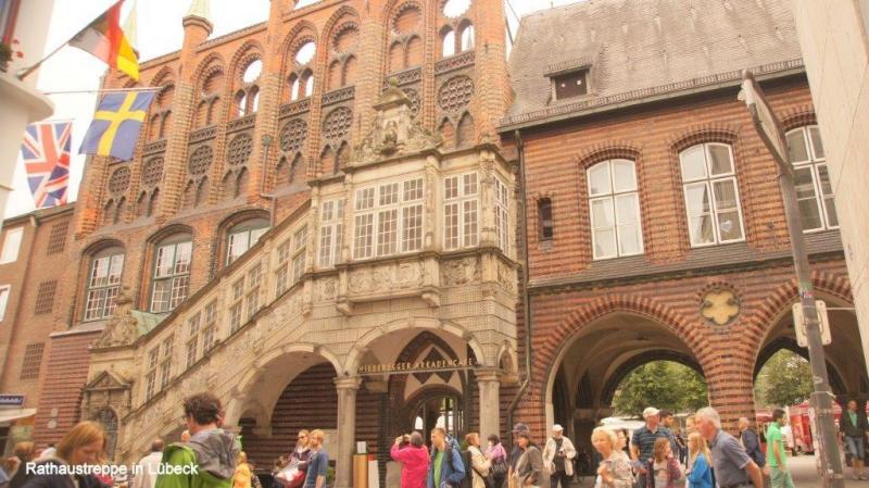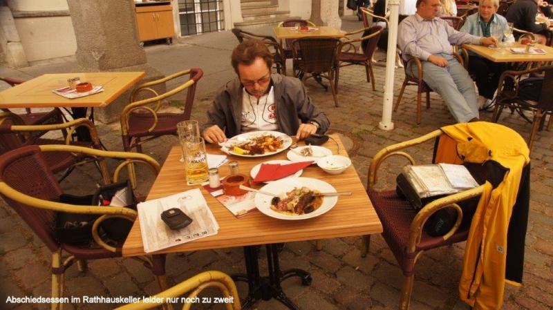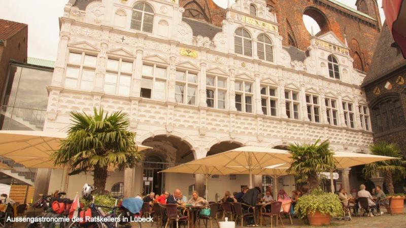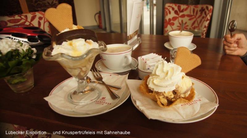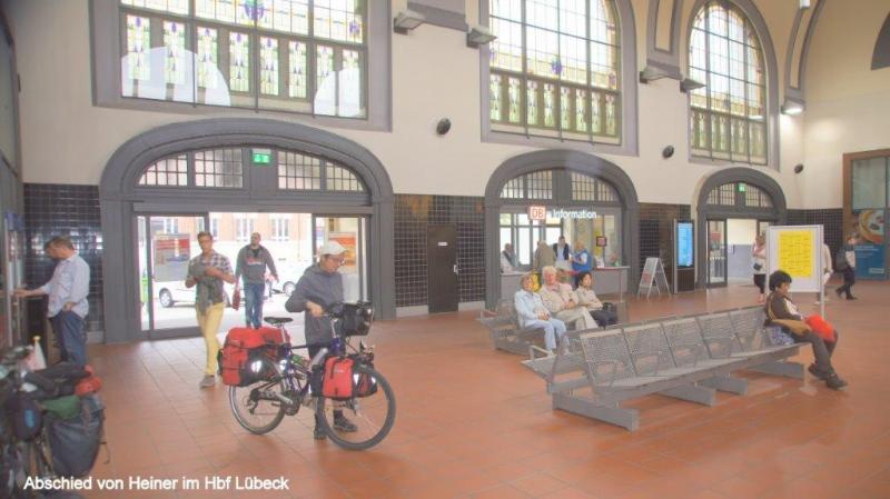 Eine reichliche Auswahl zum Frühstück bietet uns heute morgen die JH Scharbeutz. Heiner freut sich, da es auch Kakao zu seinem Kaffee gibt. Nur ein Frühstücksei fehlt nach seiner Meinung. Wir sortieren noch einmal Sachen aus, die wir Hendrik mitgeben möchten, der bereits am kommenden Sonntag aus beruflichen Gründen alleine nach Hause fahren muss. Den verbliebenen, aber nicht funktionierenden Kocher, das große Zelt und einige andere Teile werden in Tüten gepackt, die wir bei Kathrin und Hendrik noch vorbeibringen. Ja und bei diesem Besuch passiert etwas, was ich gerne schon viel früher gesehen hätte. Heiners fast immer getragenes Werbetrikot seines früheren Arbeitgebers erhält von Wiebke einen großen „Glücksklecks“ aufgedrückt, was ihn nun zuletzt doch noch zwingt, sein zweites Trikot mit Schweizer Werbeaufdrucken anzuziehen. Mit diesen Trikots konnte Heiner sich immer gut vom Outfit der angetroffenen Reiseradler absetzen. Eine besonders interessante Variante war eine Kombination mit einer olivfarbenen Zipphose. Wir verabschieden uns von den jungen Eltern Kathrin und Hendrik und fahren wieder die Küstenpromenade von Scharbeutz, Timmendorfer Strand und Niendorf weiter. Vor Travemünde geht es noch eine kurze Strecke an einer Steilküste entlang, dann noch durch ein Waldgebiet und schon stehen wir im Hafen von Travemünde. Die Anlegestelle des Fährbootes rüber nach Priwall schließt unseren Kreis der Ostseeumrundung. Der Kilometerzähler zeigt 7.341 km, wobei hier auch die Anfahrt von Lübeck mit enthalten ist. Wir sind überglücklich, dass wir gesund und ohne große Blessuren diese gewaltige Strecke überstanden haben. Hier und jetzt nach 114 Tagen ist die Ostseeumrundung zu Ende. Natürlich sind wir in Gedanken bei unserem Radkollegen Karl-Josef, den das Pech direkt zweimal erwischt hat. Wegen einer gesundheitlichen Vorsichtsmaßnahme musste er in Danzig für kurze Zeit nach Hause, stieß aber Gott sei Dank in Kaliningrad vor der Überquerung der Kurischen Nehrung wieder zu uns und setzte die Reise mit vollem Engagement fort und war für uns eine ganz wichtige Unterstützung bei unserem Abenteuer. Nach einem kapitalen Rahmenschaden am Fahrrad musste er, wie er selber ja berichtet hat, die Tour 50 km vor der dänisch-deutschen Grenze leider abbrechen. Natürlich können wir uns gut in seine Situation hineinversetzen, welcher Ärger und welch tiefe Enttäuschung sind damit verbunden, wenn man so kurz vor dem Ziel aufgeben muss. Auch für uns ist es bitter, nach all den Strapazen und wunderbaren Begegnungen und Erlebnissen nicht gemeinsam ins Ziel zu kommen. Als ich mittags mit Karl-Josef telefoniere, muss ich schon schlucken und er gesteht, dass ihm zum Heulen sei. Wir vereinbaren dann, dass wir da wo wir sind, auf das Wohl des jeweils Anderen trinken. Eine kurze Strecke von etwa 25 km geht es dann noch von Travemünde bis nach Lübeck. Unterwegs müssen wir mit einem Shuttlebus einen Tunnel unter die Trave unterqueren und treffen hier auf eine weitere Abenteuerin. Lovisa ist bereits über 800 km zu Fuß, aus einem Vorort von Stockholm auf dem Jakobsweg unterwegs und hofft, im Dezember ihr Ziel in Santiago de Compostela zu erreichen. Natürlich erhält sie unsere Adressen, falls sie in Köln eine Unterkunft benötigt. Unser Weg in Lübeck geht unmittelbar zum Marktplatz der Altstadt. Aufmerksame Leser des ersten Tages werden erraten, wo es uns hinzieht. Aber Halt, zunächst brauchen wir etwas Herzhaftes. Da wir uns ja auskennen in Lübeck gehen wir − wie beim Beginn unserer Reise − wieder in den Ratskeller. Diesmal ziehen wir jedoch die Außengastronomie vor. Ein großes Bier ist zur Feier des Tages natürlich unabdingbar. Zum Essen bestellt Heiner etwas Fischiges, während ich etwas Fleischiges bevorzuge. Meine nicht ganz ernst gemeinte Frage an eine nette Serviererin, ob denn der Ratskeller zur Belohnung ein Bier spendiert, da wir ja vor knapp 4 Monaten hier unsere Ostseeumrundung gestartet haben, bleibt zunächst noch unbeantwortet. Zum Schluss des Essens bringt uns Hanka, die aus Tschechien stammt, dann doch noch jedem ein leckeres Glas Bier auf die tolle Leistung. Nun wird sich vielleicht der eine oder andere fragen, was gab es zum Nachtisch. Die kulinarische Attraktion von Lübeck ist … wer es noch nie probiert hat, kann noch viel entdecken! Ja, es ist das Niederegger Marzipaneis! Und dafür wechseln wir vom Ratskeller ins Niederegger-Café. Im Salon finden wir gerade noch einen kleinen Tisch, an dem wir uns niederlassen. Aber was entdecken wir auf der Karte? Es gibt auch Niederegger Marzipan-Milchkaffee, den wir natürlich sofort auch probieren müssen. Bitte erlaubt mir unsere Bestellungen zu zitieren! Heiner: Knuspertrüffeleis mit 3 Kugeln, bestehend aus Marzipan-, Mandel- und Nougateis mit einer Sahnehaube. Jürgen: Lübecker Eisportion, bestehend aus Marzipaneis auf frischer Baumkuchenscheibe, eine Sahnehaube mit Eierlikör und gerösteten Mandeln. Nun, wem jetzt noch nicht das Wasser im Mund zusammengelaufen ist, versteht nicht, wie es Nordlandfahrern nach so langer Zeit der Entbehrung ergeht. Übrigens waren wir danach „pickepackesatt“. Danach begleite ich Heiner noch zum Lübecker Hauptbahnhof und verabschiede mich von meinem treuen Radelpartner, der mich geduldig die gesamte Zeit ertragen hat. Da Heiner zum ersten Mal überhaupt eine solche Fahrradreise gemacht hat (lassen wir die Trainingswoche entlang der Ruhr einmal beiseite), kann ich nur mit Bewunderung seine Energie und sein Durchhaltevermögen loben. Er fährt nun nach Berlin, wo seine Enkelin Geburtstag feiert. Dort wird auch Ulrike sein, mit der er dann nach Meerbusch wieder zurück fährt. Seit geraumer Zeit überlege ich, auch noch bis Köln zurück zu radeln. Ich hatte im Laufe des Tages für mich entschieden, noch eine Nacht in Lübeck zu bleiben und gehe daher ins Touristenbüro, um mich für die Rückreise beraten zu lassen. Ich komme mit einer netten Kenianerin ins Gespräch, 