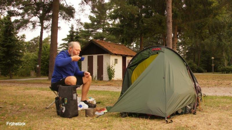 Eigentlich könnte ich mich ja noch 10 mal hin und her drehen, bevor ich aus dem Zelt krieche, denn ich habe mich ja entschieden, einmal einfach anzuhalten. Die Freiheit zu erleben, kein selbstgesetztes Ziel zu erreichen, mich keinem terminlichen Zwang aussetzen zu müssen, den Tag einfach kommen zu lassen, zu faulenzen, mich einfach mal wieder hinlegen, Stunden der Muße! Kann ich das, halte ich das aus? Eine innere Uhr und die mit der aufgehenden Sonne zunehmende Wärme im Zelt lassen mich zur gewohnt frühen Zeit dann doch aufstehen. Beim Gang zur morgendlichen Dusche nehme ich den kleinen Kochtopf und den Tauchsieder mit und setze Kaffeewasser auf. Nach dem Frühstück inspiziere ich die Straßenkarte 1:200T um eine geeignete Fahrroute Richtung NRW zu finden. Kies-, Schotter- und Sandwege hatte ich an den beiden letzten Tagen genug. Daher präferiere ich für den morgigen Abschnitt möglichst auf Bundes- und Landstraßen zu bleiben. Leider finde ich in der gewohnten Entfernung von 80-100km der anstehenden Wegstrecke keinen Campingplatz. Ich rufe meinen Freund Ferdi an und bitte ihn im Internet einmal zu recherchieren, ob er hier etwas finden kann. Leider Fehlanzeige! Es gibt im Gebiet der Lüneburger Heide ohnehin nur wenige Campingplätze. Also muss ich morgen auf gut Glück solange fahren, bis ich etwas finde. Ich überlege, dass ja reichlich abgeerntete Felder verfügbar sind, aber zur Zeit vor dem Ackern und Grubbern an vielen Stellen Jauche ausgefahren wird, was für intensive Wahrnehmung der landwirtschaftlichen Ausprägung dieser Region sorgt. Aber irgendeine Stelle, vielleicht in einem Waldstück wird sich wohl finden, um meine Hundehütte aufzubauen. Mit dieser Ungewissheit setze ich mich an die Weiterbearbeitung von Blogs, die unsere eifrigen Leser begierig erwarten. Da die Akkukapazität jedoch begrenzt ist und es mir zu kritisch ist den Laptop alleine in der Küche oder im Waschraum zu lassen, ist die Arbeit hiermit zeitlich begrenzt. Das verschafft mir dann doch, dass ich mich einfach mal wieder hinlege und nichts tue. Wer mich kennt der weiß, dass dies etwas Ungewohntes für mich ist. Mir gehen viele der Erlebnisse unserer nunmehr fast 4-monatigen Rundreise durch den Kopf, Schwierigkeiten und Glücksmomente, Begegnungen und neue Erfahrungen. Ich überlege, dass es gut wäre in einem separaten Kapitel unserer Website ein Resümee unseres Abenteuers zu ziehen. Daher möchte ich in diesem Blog hierauf nicht näher eingehen. Zum Mittagessen gab es eine kleine, kalt gegessene Dose Nudelsuppe mit Fleischklößchen, dazu 1-2 Schlucke Rotwein und zum Nachtisch wieder einen Becher Früchtemilchreis. Um dem Bewegungsdrang nachzugehen wandere ich dann einige Zeit im angrenzenden Wald und um den Badesee herum, wo ich ohne die Hektik der letzten Monate versuche die Stille einzufangen. Aber es fällt mir schwer nach dieser turbulenten Zeit und so laufe ich zum Zeltplatz zurück und nehme mir mein Fahrrad unter die Lupe. Ich hatte mir in Scharbeutz noch einmal die Kette und die Schaltungen nachgeölt, die immer noch gut ihren Dienst tun. Aber die Hinterradfelge weist die beiden Dickstellen auf, die immer wieder an den Backen der Hinterradbremse anlaufen. Schiebe ich das Rad spüre ich deutlich, wie das Hinterrad mehr oder weniger blockiert. Beim Fahren ist die Schwungmasse so groß, dass es kaum auffällt und nur durch ein anschlagendes Geräusch sich bemerkbar macht. Es besteht die Gefahr, dass wie es mir vor vielen Jahren bei einer Fahrt in Luxemburg passiert ist, die Felgenflanke aufreißt und die Fahrt dann zu Ende ist. Einmal habe ich bereits versucht die Hinterradbremse ganz auszuhängen, da sie dann nicht mehr anschlagen kann. Hierbei habe ich mich aber sehr unsicher gefühlt, alleine auf die Vorderradbremse angewiesen zu sein. Es bleibt also eine Zitterpartie, wie lange die Felge noch durchhält. Hoffentlich habe ich dann die Möglichkeit eine Zugstrecke zu erreichen, um nach Hause zu kommen (es gibt für Radle zwar einen ADFC als Gegenstück zum ADAC, aber einen Abschleppdienst für Reiseradler gibt es nicht). Mit diesen Sorgen endet mein heutiger Bericht und mein ansatzweise gelungener Ruhetag.