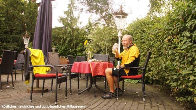 Es regnet heute Morgen und ich lasse es verständlicherweise gemächlich angehen. Zum ersten Mal frühstücke ich daher notgedrungen aber regengeschützt in meinem kleinen Zelt. Ich bin erstaunt, wie problemlos das klappt. Mein Kaffeewasser habe ich mit dem Tauchsieder im Waschraum heiß gemacht, so dass ich mit 2 Tassen Kaffee meine Lebensgeister aufwecke. Etwas eng wird es dann doch, als ich versuche die Straßenkarte auszubreiten, um einen möglichen weiteren Weg für heute in Richtung Wesel zu finden. Eine Strecke über eine Landstraße und dann ab Steinfurt entlang der Bundesstraße B 249 in Richtung Coesfeld, so ist mein Plan. Glücklicherweise hört der Regen gegen 10:00Uhr auf und ich räume zusammen und lade alles auf mein Rad. Beim Losfahren schaue ich sorgenvoll, wie sich der Reifen auf dem asphaltierten Weg eindrückt. Aber es geht nicht anders, bei mehr Luft ist die Gefahr zu hoch, dass die Felgenflanke aufreißt. Noch vorsichtiger fahren ist die Devise. Die Straßen sind erstaunlich schnell abgetrocknet, was das Fahren angenehm macht. Aber ein deutlich höherer Rollwiederstand macht sich wegen der fehlenden Luft im Hinterrad bemerkbar. Aber was soll‘s, bei rund 4 Monate Training muss ich solche Beschwerlichkeiten wegstecken. Ich überquere mal wieder den Dortmund-Ems-Kanal und weiß an einer Wegegabelung nicht so richtig weiter. Wie so oft auf unserer Reise kommt ein sachkundiger Radler und fragt, ob er weiterhelfen könne. Ich erkläre ihm, dass ich in Richtung Steinfurt und dann nach Coesfeld fahren möchte. Ja, da gäbe es einen tollen Fahrradweg über eine ehemalige Bahnstrecke bis nach Coesfeld, die erst im letzten Jahr wieder um ein Stück erweitert worden sei. Gerne ist er bereit, mit zu fahren und mir den Weg auf diese Strecke zu zeigen. Wilhelm ist an diesem Morgen schon an die 50 km gefahren und legt ein gutes Tempo vor. Erst jetzt merke ich, dass ich wegen der fehlenden Luft im Hinterrad kräftig gefordert bin. Es geht auf sehr verschlungenen Wegen (hätte ich alleine nie gefunden) zunächst ein gutes Stück auf Rheine zu und dann erreichen wir den gut ausgebauten und befahrbaren Radweg. Wilhelm fährt auch hier noch ein gutes Stück mit, biegt dann aber, nachdem ich mich herzlich bei ihm bedankt habe, nach links ab, um den Heimweg anzutreten. So geht es immer eben und auf langen Strecken geradeaus weiter auf dem Bahndamm. Es sind an diesem Sonntag einige Radler, Rollschuhfahrer und Fußgänger hier unterwegs. Mir fällt auf, dass nun schon die ersten Blätter von den Bäumen fallen und verschiedene Stellen sehen bereits richtig herbstlich aus. Aber wir haben doch gerade erst Ende August? Als wir am 27. April gestartet sind, da fingen manche Bäume erst zaghaft an auszutreiben. Die meisten Getreidefelder sind bereits abgeerntet aber einiges Getreide steht auch noch auf dem Halm. Mais-, Rüben- und Kartoffelfelder wechseln sich mit Weiden und bereits neu bearbeiteten Ackerflächen ab. Wie kurzweilig und spannend ist doch diese Reise gewesen, mein Zeitgefühl ist verkümmert. Wie oft waren wir uns uneins, wenn wir den Wochentag diskutiert haben. Hätten wir das Tagebuch nicht geführt, wären wir ohne auf die Uhr zu sehen (gibt den Wochentag an!) vermutlich ganz aus der Spur gelaufen. Die Bahnlinie führt weitestgehend durch dünn besiedeltes Gebiet und nur die Städte Steinfurt, Horstmar, Rosendahl und Coesfeld liegen direkt an der Strecke. In Rosendahl mache ich in einem Gasthof Mittagspause und bestelle mir das Sonntagsmenü, bestehend aus leckerer Rindfleischsuppe mit Klößchen und Eierstich, das Hauptessen mit Rinderbraten, Kartoffeln und feinem Gemüse, zum Nachtisch ein leckeres Eis mit frischen Früchten. Wem jetzt das Wasser im Mund zusammengelaufen ist, nehme sich ein frisches kühles Getränk und schlucke es herunter! Danach geht es mit dem Rad weiter bis nach Coesfeld, wo der schön ausgebaute Radweg leider zu Ende ist. Mit einigen Schlenkern durch Coesfeld finde ich eine Landstraße nach Reken. Während es nach der ebenen Fahrt über den Bahndamm auch hinter Coesfeld noch weiter flach geht, kommt dann überraschend eine Auffahrt nach Reken. Erst als ich genauer auf meine Straßenkarte sehe, entdecke ich einen schönen Aussichtspunkt, der mit 133m angegeben wird. Nach dem morgendlichen Regen ist es nun sehr schwül geworden und als ich im Ort die Steigung hinter mich gebracht habe, komme ich an einem Kiosk vorbei, wo ich mir ein alkoholfreies Weizen mit einer Scheibe Zitrone bestelle. Ich nehme mir meine Karte mit, um ein mögliches Ziel auszusuchen. Auch kontrolliere ich den aktuellen Tageskilometerstand und bin überrascht, dass ich schon über 80km gefahren bin. Der Campingplatz, den ich mir ausgesucht hatte Richtung Wesel liegt aber noch rund 30km weiter. Da ich durch die Schwüle und den höheren Rollwiederstand meines Rades müde geworden bin, überlege ich, hier in Reken den Campingplatz zu nehmen. Über Wesel wären es dann morgen über 130 km, aber wenn ich direkt auf Duisburg zu und zunächst linksrheinisch fahre und in Kaiserswerth mit der Fähre nach Meerbusch übersetze, könnte es klappen. Die Strecke morgen ist dann zwar länger als heute, aber Heiner wird ja auch erst abends in Meerbusch sein. Also steuere ich den Campingplatz von Groß Reken an, wo ich auf die sehr nette Rosemarie treffe. Sie hat die Leitung des Platzes auf ihre Tochter übertragen, aber arbeitet immer noch unterstützend mit. Ich unterhalte mich mit ihr eine ganze Weile über verschiedene Themen und sie ist sehr interessiert an meinen Erlebnissen zu unserer Ostseeumrundung. Sie berichtete u.a., dass leider an zwei folgenden Tagen zwei Radfahrer, der Eine in Richtung und der Andere vom Nordkap kommend hier waren, nur fand sie schade, dass die Beiden sich leider nicht hätten austauschen können. Sie zeigt mir die möglichen Zeltplätze, von denen ich mir dann einen aussuche. Am Abend nutze ich die Möglichkeit in einer angeschlossenen Gaststube mir eine Currywurst zu