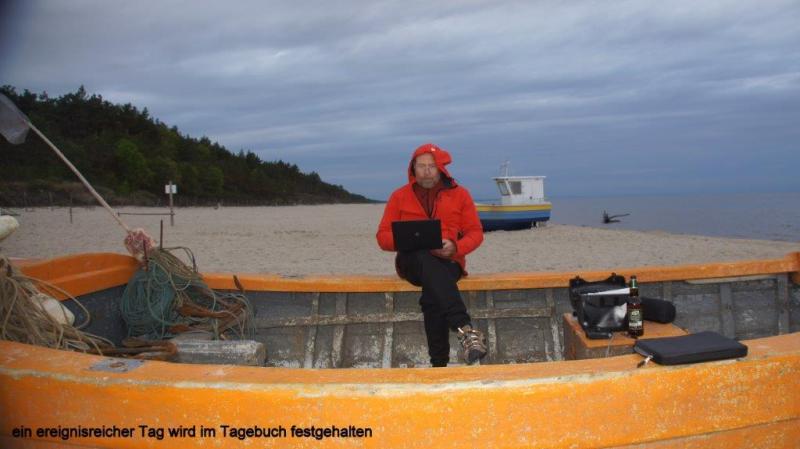 Nach 2 Tagen Pause machte das Fahren wieder so richtig Spaß und nach einer Strecke von ca. 20 km finden wir in Sobieszewo ein einladendes Restaurant mit dem Namen „Tawerna Delfin“. Der Gastwirt empfängt uns bereits am Gartentor auf Deutsch und fragt nach unseren Wünschen. Das Essen war wirklich exquisit und Heiner meint, dies sei das beste Restaurant bisher. Auch die Inneneinrichtung mit einem großen Kamin war sehr ansprechend. Ich machte noch ein Foto mit der ganzen Familie und dann ging es weiter bis unser Weg an dem Fluss Prezekop abrupt endete. Wir sahen aber eine Fähre auf der anderen Seite des sicher 1 km breiten Flussdeltas. Ein dreijähriger Junge mit Namen Robert unterhielt uns und wollte auch gerne aufs Foto. In Stegna dem Tor zur „Frischen Nehrung“ fanden wir einen schönen kleinen Campingplatz nahe an der Küste. Die Chefin bot uns einen kleinen Campingwagen an mit der Bemerkung, in der Nacht würde es sicher sehr kalt und vielleicht sogar regnen. Wir nahmen das Angebot gerne an – brauchten wir doch mal kein Zelt auf und ab zu bauen – und konnten schnell noch zum Strand fahren. Dort haben wir uns dann in ein altes Schifferboot gesetzt (siehe Foto!) mit einem kleinen Abendtrunk und unser Tagebuch geschrieben. Aufregung gab es noch nach der Rückkehr auf den Campingplatz, als Heiner vermeintlich sein Handy verloren glaubte. Zum Glück fand es sich aber im Wohnwagen wieder.