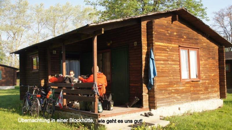 Wir fahren danach runter ins überschaubare Hafengelände und suchen uns eine kleine Taverne zum Mittagessen. Auch hier vermute ich bei den weiblichen Lesern aufkommende Fragen: Wieso kochen die denn nicht mal selber? Nun, weil man so blöd nicht sein kann. Ein leckeres Fischgericht (ok, bei mir ist es eher ein Fleischgericht, Kostenfaktor 0,6 zu Fisch), z.B. gegrillter Lachs, mit frischem Salat und Beilagen kostet ca. 8 € mit einem leckeren duży Piwo (großes Bier = 0,5 l) für 2 €. Man möge diesen Luxus uns Ruheständlern bitte zugestehen. Danach kaufen wir auf dem Weg zurück zum Campingplatz noch Vorräte für morgen ein, u.a. eine Flasche Wódka Żołądkowa Gorzka, die uns am nächsten Tag jedoch wegen Leerung nicht mehr zur Verfügung steht. Nach einer Eingangsbemerkung seitens Heiner: „Ja, aber mir bitte nicht so viel“ wurde beim Verteilen des letzten Tropfens „Kann ich mich dran gewöhnen“! Das war auch der Grund für die nicht ganz jugendfreie Unterschrift des Schwanenfotos des Vortages. Wir bummeln so in den Abend rein und schlüpfen schon früh in ein duftendes, frisch bezogenes Bett (wer kann sich dieses Erlebnis vorstellen, nach über 2 Wochen immer klammer werdenden Schlafsäcken). Draußen wird es wieder kalt und hier lockt das warme Bett. Aber bevor uns die Müdigkeit vereinnahmt, rauschen noch bange Gedanken durch unsere Köpfe. Was erwartet uns morgen? Wie schrieb der Mann, der alleine mit dem Fahrrad die Ostsee umrundete bei der Begegnung mit angreifenden Hunden? Er habe dann immer die Straßenseite gewechselt, um Autos und LKWs zwischen sich und die Hunde zu bringen. In einem anderen Buch wurde empfohlen, eine Wasserflasche zum Spritzen bereit zu halten, dass würde die Hunde auf Abstand halten und irritieren. Und nun der Dresdener Radler, der genau auf unserer Route von morgen von Hunden verfolgt und belästigt worden ist. Wie werden wir den Auto- / LKW-Verkehr erleben? Wie ist der Zustand der Straßen? Was erwartet uns an der Grenze? Finden wir die von Simeon vorgebuchte Pension? Wir haben keine genaue Karte von Kaliningrad, wir brauchen einen Stadtplan. Kommen wir mit der kyrillischen Schrift zurecht?