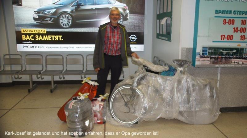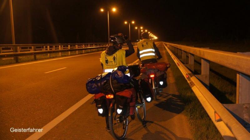 Mit ca. 20 minütiger Verspätung landet die Propellermaschine aus Riga kommend, wo Karl-Josef zwischenlanden musste. Erst kommt das Fahrrad und ich mache mich an das Auspacken, des mit Luftbläschenfolie umhüllten Edelstücks. Schon kommt eine Kontrolleurin und fragt nach dem Gepäckbeleg. Ich sage ihr freundlich, dass mein Freund gleich komme und sie gibt sich zufrieden. Als Karl- Josef dann kommt, ist er erst einmal ungläubig, als ich ihm die freudige Nachricht übermittle, dass er während er in der Luft war Opa geworden ist. So bestelle ich ihm die Grüße seiner Frau Ellen und überrasche ihn mit dem Namen seiner Enkelin “Wiebke“! Der kleinen Wiebke und den Eltern wünschen wir über unseren Blog alles, alles Gute und Gottes Segen! Gemeinsam packen wir weiter das Fahrrad aus, stellen den Lenker wieder gerade und schrauben die Pedale nach außen. Eine aufmerksame Dame kommt mit einem großen Plastiksack und stopft das ganze Verpackungsmaterial rein. Noch Luft in die Reifen (soll man beim Transport im Flugzeug immer etwas ablassen), Taschen dran und dann schieben wir nach draußen, wo Heiner auf die anderen Räder aufgepasst hat. Nun auch die Gratulation an den frisch gebackenen Opa von Heiner. Auf geht es nun über die schön ausgeleuchtete Autobahn. Da aber anscheinend kein weiteres Flugzeug bis zum Morgen kommt, geht das Licht nach einigen Kilometer Fahrstrecke dann aus. Nun kommt die neu installierte Beleuchtung des Fahrrads zur Anwendung (bisher habe ich darauf ja immer verzichtet), strahlend helles LED Licht mit Leuchtweitenregulierung je nach Geschwindigkeit (Protz? nein mein ingenieurmäßiger Trieb zur Perfektion, habe ich mir von meinen Mitradlern absegnen lassen)! Es läuft wirklich gut, bis wir eine Abfahrt von der Autobahn nehmen und leider wie auf der Suche zum Flughafen landen wir wieder in der Wildnis! Aber jetzt ist ja alles anders. Karl-Josef ist wieder bei uns und, na was denn, sein Garmin-Navigation! So fahren wir an einem einsamen Bauernhof vorbei, über eine Gleisanlage und endlich wieder auf eine Straße, die Heiner und ich am Vortag auf der Suche der Flughafeneinfahrt vergeblich in Gegenrichtung befahren hatten. Mit der Stirnlampe auf der Stirn um die Straßenkarte mit dem Fahrradnavi abzugleichen finden wir den richtigen Weg. Als wir eine Bundesstraße erreichen, läuft alles wie geschmiert und unsere Räder laufen auf Hochtouren. Um uns herum stockfinstere Nacht (zwischen 1:00 und 3:00 Uhr Nachts) radeln drei “Geisterfahrer“ über einsame Straßen in Richtung “Kurische Nehrung“! Oder um es mit Theodor Storms Schimmelreiter zu sagen: wer reitet so spät durch Nacht und Win(d)en, es sind drei Ostseeradler ich glaub die spinnen. Immer wieder fahren wir auf Autobahn oder Schnellstraßen, die natürlich gut befahrbar sind.