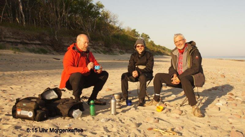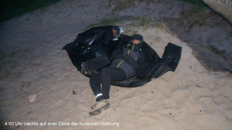 Nur in Zelenogradsk (Canz) müssen wir nochmal eine Korrektur vornehmen, da wir die A191 aus Versehen verlassen haben und in die Stadt rein gefahren waren. Keiner von uns hat irgendeine Müdigkeit verspürt und es war so toll zu fahren im nahezu autofreien Verkehr über glatte Schlagloch freie Straßen. Etwas anderes war uns noch aufgefallen, Heiner und Karl-Josef hatten die gelben Warnwesten angezogen, die mit dem Aufdruck 1,5m Abstandhalten zum Radfahrer, und genau solche Westen tragen hier in Russland die Polizisten. Nun, wir haben uns immer gewundert, dass die überholenden oder entgegenkommenden Autos immer so langsam und rücksichtsvoll an uns vorbei fuhren. Die Warnwesten haben nachts eine erstaunlich weite Leuchtkraft und so mancher russischer Raser (in Russland ist das Auto ein Statussymbol und was der Tacho hergibt, muss auch ausgenutzt werden) wird in der Nacht, als er an uns vorbei gefahren ist gedacht haben, jetzt fahren die Bullen nachts schon auf dem Fahrrad Streife! Interessant auch, als wir 2 mal angehalten haben, um zu verschnaufen, wie zahm die Autos an uns vorbeigekrochen sind, weil sie eine nächtliche Kontrolle vermuteten. Als wir die Einfahrt zur Kurischen Nehrung erreichen, sind wir etwas erstaunt, da auf der Einfahrtseite (rechts) eine Schranke die Zufahrt blockiert. Daneben ist ein Kassenhäuschen und wir wissen nicht, was es damit auf sich hat, da alles nur kyrillisch beschrieben ist. Heiner entscheidet für uns, wir fahren einfach weiter. Nachdem auch 2 Autos einer entgegenkommend und der andere in Fahrtrichtung einfach um die Schranke herum fahren, folgen wir der Heiner’schen Entscheidung und fahren einfach in die fast 100km lange Kurische Nehrung herein. Nach ca. 20km weiterem Radeln und etwa 4:00 Uhr morgens merken wir doch die aufkommende Müdigkeit und Karl-Josef und sein Navi verraten uns einen kleinen Pfad der auf die Seite zur Ostsee führt (die andere Seite ist ja das “Kurische Haff“). Über einen schmalen Pfad schieben wir unsere Räder und kommen an einer Düne an. Wir lehnen unsere Räder an Bäume und erklimmen die Düne. Heiner hat die glorreiche Idee, die Zeltunterlage vom großen Zelt als Liegefläche zu nutzen und wir legen uns so gut es geht nieder. Um es genauer zu erklären, da es am Vortag ja rel. warm war einfach ohne zusätzlich Zudeckung! Karl-Josef und mein Problem war dann allerdings, dass es uns doch mit der Zeit zu kalt wurde (Heiner schläft ja in allen Situationen problemlos). Nach einem kurzen Nickerchen stehe ich auf und entdecke am Strand ein Licht, wo in einiger Entfernung Jemand mit Stirnlampe am Wellenrand etwas absucht. Ok, ich lege mich wieder hin und versuche trotz der Kälte etwas zu schlafen. Irgendwann höre ich Karl-Josef jemanden freundlich grüßen. Der Mann schiebt ein rostiges Fahrrad mit sich. Was er am Strand gesucht hat, bleibt sein Geheimnis. Aber dass er ausgerechnet da, wo wir unser Nachtlager am Strand aufgeschlagen hatten vorbeikommen musste, war schon merkwürdig. Natürlich hatten wir etwas Sorge um unsere Fahrräder und das Gepäck, dass wir natürlich alles darauf gelassen hatten, aber es gab keine weiteren Schwierigkeiten. Gegen 5:00 Uhr setzt die Morgendämmerung ein und ich erkundete in einem ersten Antritt den Strand. Der Versuch, ein kleines Feuer zum Wärmen zu entzünden schlägt fehl, da alles durch den Morgentau viel zu nass ist. Daher kam dann später doch der Benzinkocher zum Einsatz, um Wasser für einen Kaffee zu kochen. Letztlich sitzen wir 3 dann auf unseren 3Beinhockern und genießen frischen Kaffee direkt am Strand mit dem Geräusch der Brandung als Untermalung. Als die Sonne unsere Glieder aufgewärmt hat, machen wir uns wieder auf unsere Räder und es geht weiter in Richtung Osten. Als wir nach etlichen Kilometer eine abzweigende Straße in Richtung Haff entdecken, wollen wir hier auch einen Blick drauf werfen. Das Haff ist so groß, dass man die Landseite teilweise nicht mehr sehen kann. Das Ufer ist mit hohem Schilf bewachsen. Es gibt einen kleinen Anlegesteg mit einem kleinen Motorboot. Auf einem Tisch stehen mehrere Körbe mit Fischen und 2 Frauen wiegen, vermessen und nehmen jeweils eine Schuppenprobe von den Fischen. Nun wurde uns klar, woher der Verwesungsgeruch kam, den wir immer wieder wahrgenommen haben. Auch an anderen Stellen, wo wir einen Blick auf das Haff werfen, liegen überall tote Fische am Ufer. Hier scheint eine ökologische Katastrophe vorzuliegen. Da wir heute Samstag haben, gibt es relativ wenig Verkehr auf der Straße und dann sind wir auch schon kurz nach Mittag an der russisch – litauischen Grenze. Ein netter russischer Grenzbeamter bringt seine deutschen Brocken an den Mann. Ein ganz entspannter und angenehmer Dialog. Bei der litauischen Grenzstation werden wir nur durchgewunken. Am frühen Nachmittag kommen wir nach Nida (Nidden) wo es einen Campingplatz gibt. Hier wird zunächst Geld gezogen und anschließend gehen wir essen. Trotz des Verwesungsgeruchs aus dem Kurischen Haff bestellt Heiner Fisch, was uns einige Kommentare entlockt. Ansonsten ist Nida sehr touristisch ausgerichtet. Auf dem Campingplatz überwiegen holländische Campingwagenfetischisten, aber hier treffen wir auch Radreisende an. Es gibt etwas Regen und in einiger Entfernung tobt ein Gewitter, was uns aber nicht abhält den verpassten Schlaf der vergangenen Nacht ausgiebig nachzuholen.