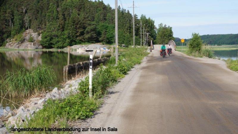 Frühaufsteher muss man in Finnland wirklich suchen. Liegt das möglicherweise an der langen Helligkeitsphase während der Sommerzeit? Aktuell ist es gerade mal vielleicht 3 Stunden dunkel! Aber es hat ja auch etwas für sich, wenn es morgens ruhig und gelassen zugeht. Vielleicht liegt es auch am Saunen, da Heiner am Vorabend, wie gefühlte 80% der Campingplatzbewohner, auch noch in die Sauna geschlüpft war und somit wie alle anderen Finnen heute Morgen nicht in die Senkrechte kommen mochte. Nur hatte Heiner die Sauna erst nach der ausgewiesenen Zeit besucht und wurde dann aber abrupt durch ein Pärchen, das die Sauna wohl für sich alleine haben wollte, vertrieben. Dennoch meinte er am nächsten Morgen nur, dass er nach einem Saunabesuch besonders gut schlafen könne. In einer kleinen Blockhütte wird auf Elektro-Kochplatten schnell das Kaffeewasser aufgesetzt und der Tisch feierlich geschmückt. Denn schon wieder wird einer während unserer Abenteuertour ein Jahr älter. Ok, so etwas passiert halt, wenn man so lange unterwegs ist! Nun meine Hoffnung ist ja, dass wir zu meinem Geburtstag Ende November die Ostseeumrundung abgeschlossen haben! Diesmal feiert Karl-Josef sogar einen halb gerundeten Festtag. Natürlich erhält er aus 2 vollen Kehlen ein überragendes Geburtstagsständchen geschmettert, dessen Echo im Laufe des Tages durch Anrufe per Handy noch nachhallt! Da wir einige Tage ohne Internetverbindung sind, wird er die vielfältigen Kommentare in unserem Blog erst später entdecken. Die noch am Morgen gehegte Hoffnung, dass wir im Tagesverlauf nun endlich wieder ebenere Strecken erwischen, stellt sich als trügerisch heraus. Die Finnen bauen ihre Straßen immer den geologischen Strukturen nach. Dies bedeutet, dass Fahrradwege, wenn sie separat geführt werden, auch schon mal mehr ins Tal oder den Berg rauf gehen. Landstraßen nehmen alle Verwerfungen mit, die die Natur hergibt. Nur bei der parallel verlaufenden Autobahn, da hat man sich bemüht Berg und Tal zu egalisieren. Bei aller Anstrengung, die uns heute abverlangt wird, erfreuen uns kilometerlang blühende Lupinen, die in den verschiedensten Farben blühen. Zum Mittagessen geht es in ein Fastfood Restaurant (leider ohne WiFi) und wir laden Kalorien auf. Dazu gibt es hier in Finnland wie in jedem Restaurant Wasser in einer Glaskaraffe und entsprechende Gläser. Ja, wer hätte das gedacht, dass uns nach dem mäßigen Bierkonsum in Polen und dem Baltikum nun gekühltes Leitungswasser wie ein Labsal erscheint. 3 solcher Kannen werden geleert, bevor es dann weiter geht. Über den weiteren Streckenverlauf gibt es wenig zu berichten, außer dem ewigen Auf und Ab im Streckenverlauf. Bei hochsommerlichen Temperaturen, die uns zusätzlich zu schaffen machen, haben wir uns schon nach 60 km für einen Campingplatz auf einer Insel südlich der Stadt Salo entschieden. Die Insel kann durch eine angeschüttete Landverbindung erreicht werden. Nachdem wir die Platzverwalterin überzeugt haben, dass unser kleines Zelt doch nicht auch noch 17 € kosten darf, lädt uns Karl-Josef zu einem leckeren Bierchen ein. Wir trinken auf sein Wohl, haben es uns aber heute auch wirklich verdient. Mit einer kompletten Küche auf dem Platz zaubern meine Mitstreiter noch ein leckeres Abendessen und wir erleben noch einen bezaubernden Sonnenuntergang. In einer Grillhütte haben sich einige Finnen versammelt und schmettern zu Akkordeon und Gitarre schöne Volksweisen. Und wieder haben wir das Gefühl, dass reichlich Alkohol mit im Spiel ist. So genießen auch wir noch mal auf Karl-Josef ein kleines Tröpfchen aus der silbernen Plastikflasche, bevor wir in die zum Schlafen vorbereiteten Säcke krabbeln. Nur kurz kommen Fragen und Zweifel auf, ob wir denn die morgige Mammutstrecke von ca. 100 km bis zum nächsten Campingplatz schaffen. Aber dann versetzt uns die Anstrengung des Tages in einen traumlosen Schlaf. So, und nun liebe Kinder, gebt fein acht, ob die drei das denn morgen schaffen, wird euch im nächsten Bericht gesacht.